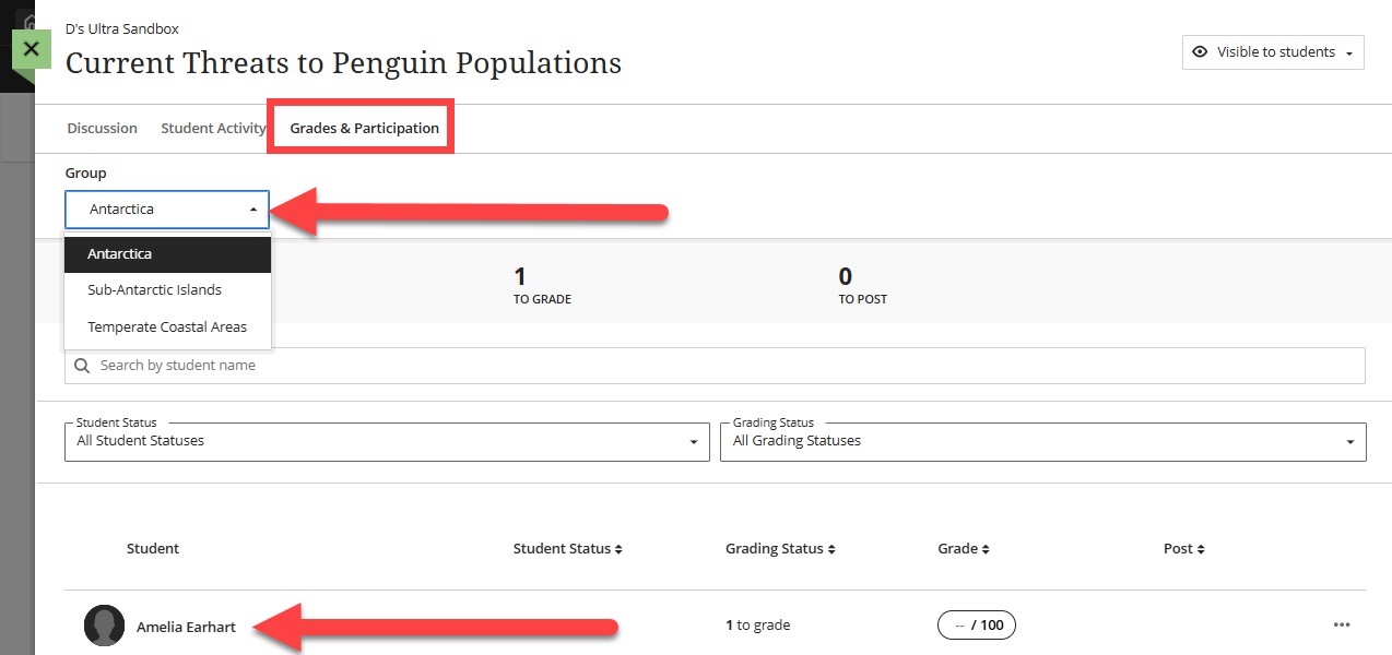 If your group discussion is graded, click on the discussion's Grades & Participation tab. Select a group and click on a group member's name to begin grading.